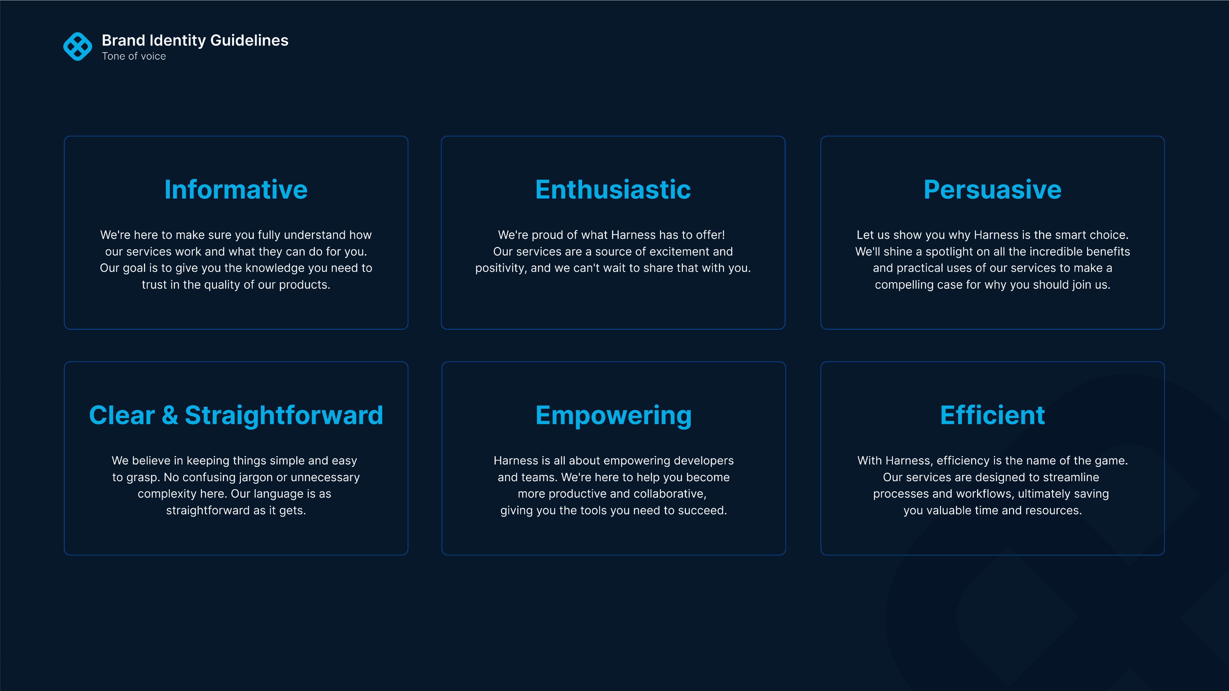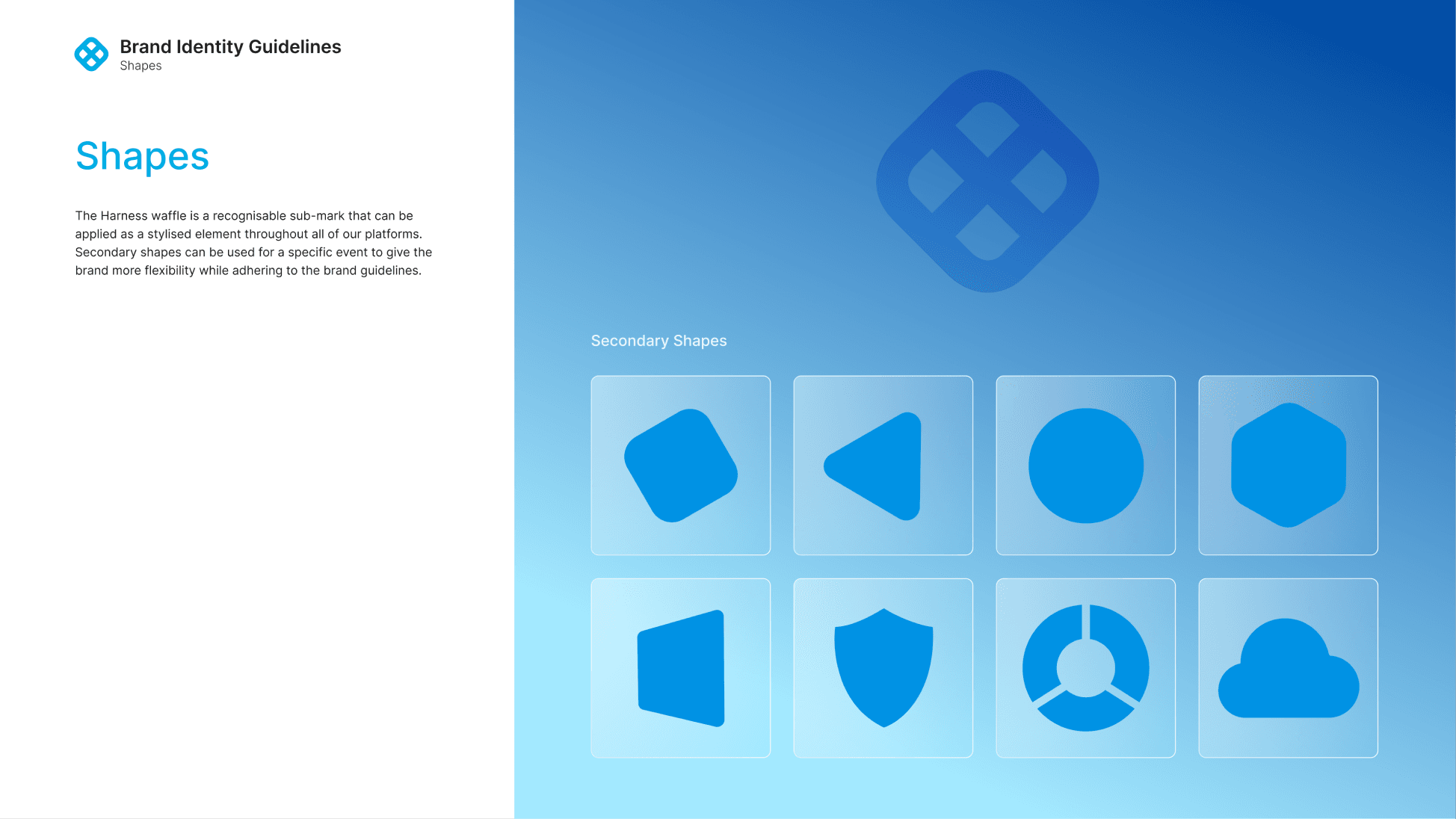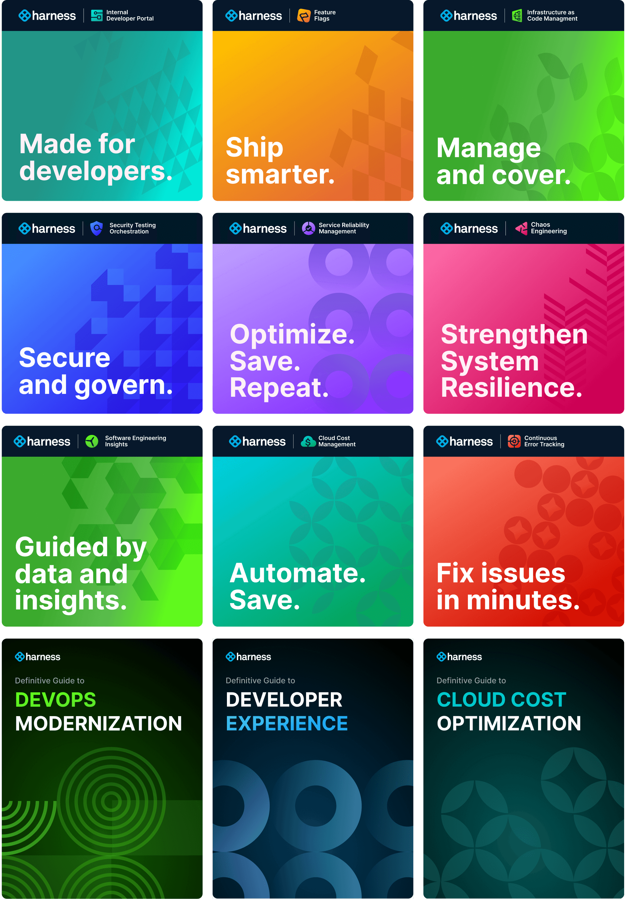 I led a visual unification initiative for Harness, where 13 independent products needed a cohesive yet flexible design language. Each pattern was inspired by how the product is used, with the intentional use of positive and negative space from the geometric form to create a distinct identity.